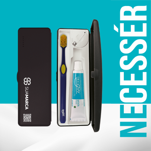 O estojo OralGift Necessér é uma forma elegante de proteger e transportar seus itens de higiene bucal, sem renunciar à qualidade e todos os benefícios dos produtos OralGift. Opções de Smilebox 2x1 (estojo + fio) ou Smilebox completo: 01 estojo Necessér, 01 escova Premium PRO, 01 creme dental 50g, fio dental 25m e 01 higienizador de língua.